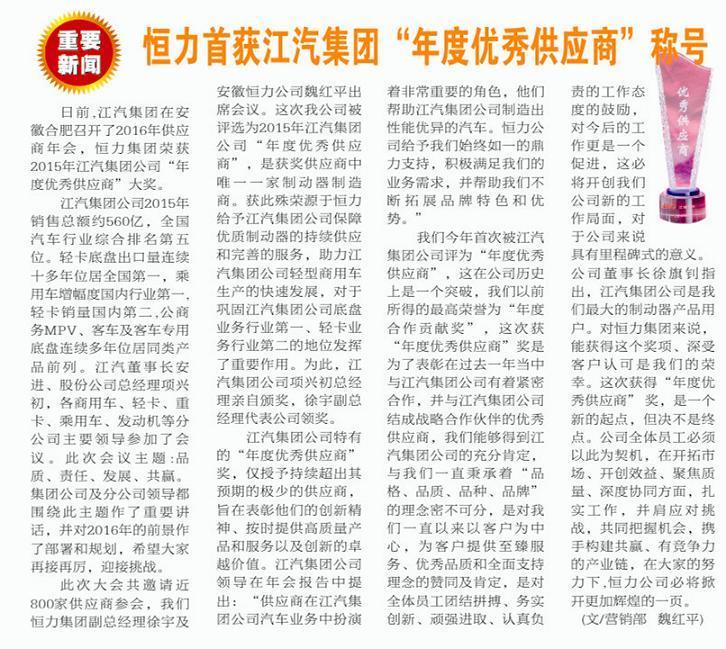恒力首獲江汽集團“年度優(yōu)秀供應(yīng)商”稱號